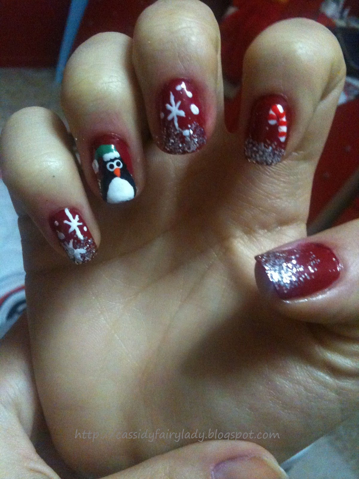 Penguenin (Aslında adı Penguş benim için) gövdesinin siyahı Gabrini Nail Art 12 numara, beyazı yine Golden Rose 04 numara. Şapkası Pastel 307. Gagasını da Gabrini Nail Art 9 numarayla yaptım. Baston şekerin beyazı aynı Golden Rose. Kırmızı çizgileri ise Golden Rose Nail Art 117 numara.