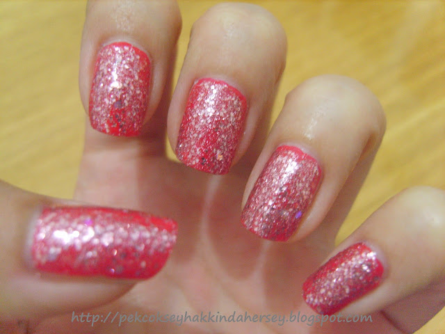 Dediğim gibi o kadar yoğun sim var ki içinde. Tek kat sürdüm yalnızca ve şu hale bakın. Bence tek başına bile opak olabilecek bir oje. Üç katta tırnağı tamamen kapatır. İçinde büyük ve orta boy altıgen simler var. Büyük olanlar renkli yansıma yapıyor. Ayrıca ojenin sim bombası olmasını sağlayan minik simler de mevcut. // It's a glitter bomb! Really! I have just applied one coat, and look at it! I think that it can be used alone as well. Three coats can be enough for wearing alone. The polish includes big and middle hexagonal glitters. The big ones are holographic. It has also little tiny glitters, which provide the polish to be a glitter bomb.